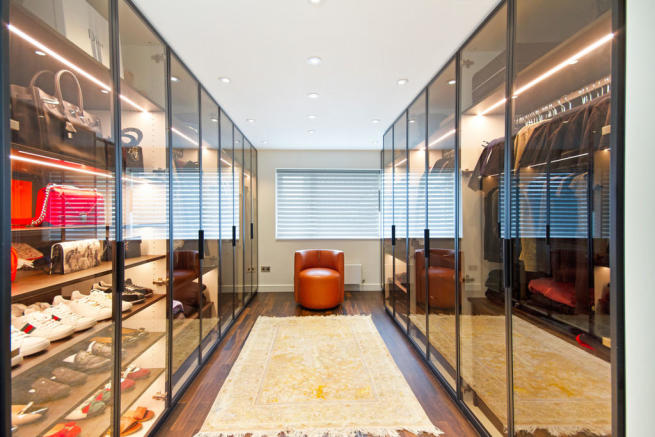 walk in wardrobe with black aluminium framed dimmed glass doors and led display lights(1).jpg